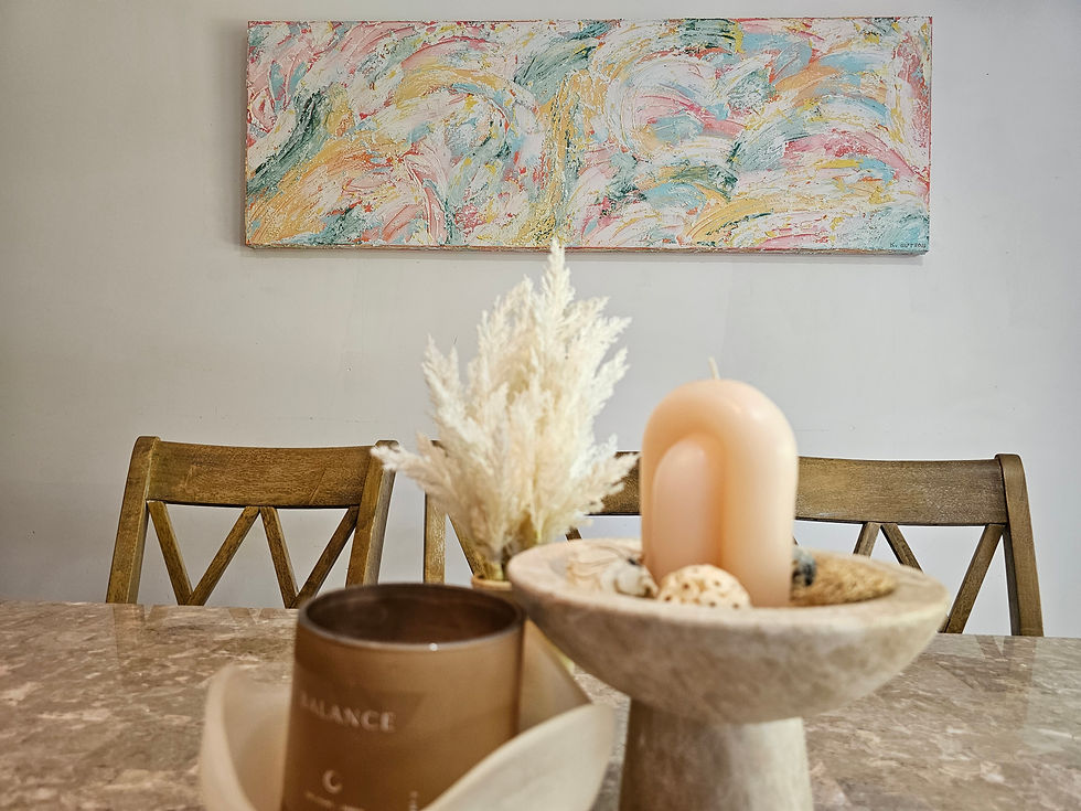 Our founder and lead artist, Kirsty Sutton, brings an intuitive, emotionally driven approach to her work — blending her interior design background with raw creative expression. Her art often begins with a moment: a shift, a memory, a feeling that needs release. Through layered texture, bold movement, and repurposed materials, her pieces become visual reflections of real human experience.